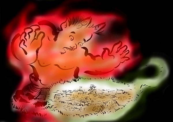 大爺山鬼赤燄身,潛入地底來遊覽,地底暗黑如煙塵,伏流如樹有枝幹,